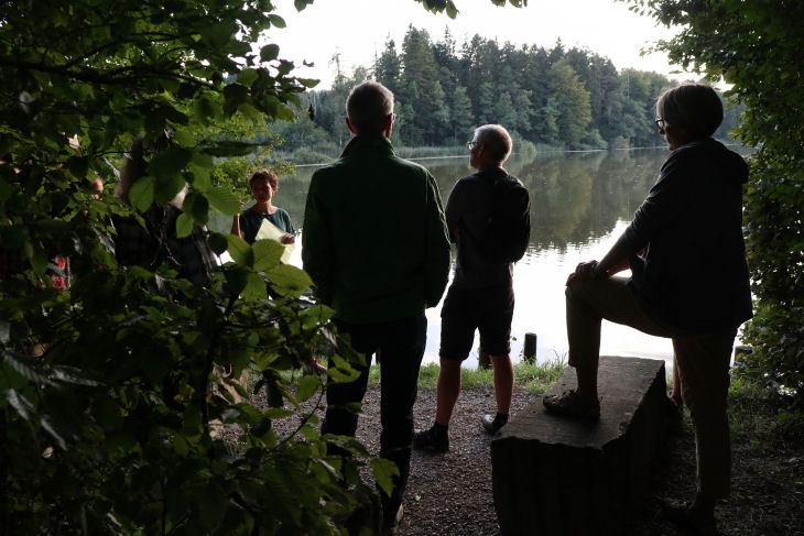 Auf einem gut stündigen Rundgang berichtet Kathrin Wittgen, Projektleiterin Pro Natura TG, viel Spannendes über Fauna und Flora des Gebiets um den Biessenhofer Weiher, einem von schweizweit 60 vergleichbaren Schutzgebieten, und weist immer wieder vor Ort auf Besonderheiten der verschiedenen Feuchtgebiets-Habitate hin. Insbesondere stellt das Gebiet ein Refugium für diverse, zum Teil gefährdete Arten von Fröschen, Kröten, Molchen und Salamander dar. Hier einige Impressionen von diesem Anlass. |